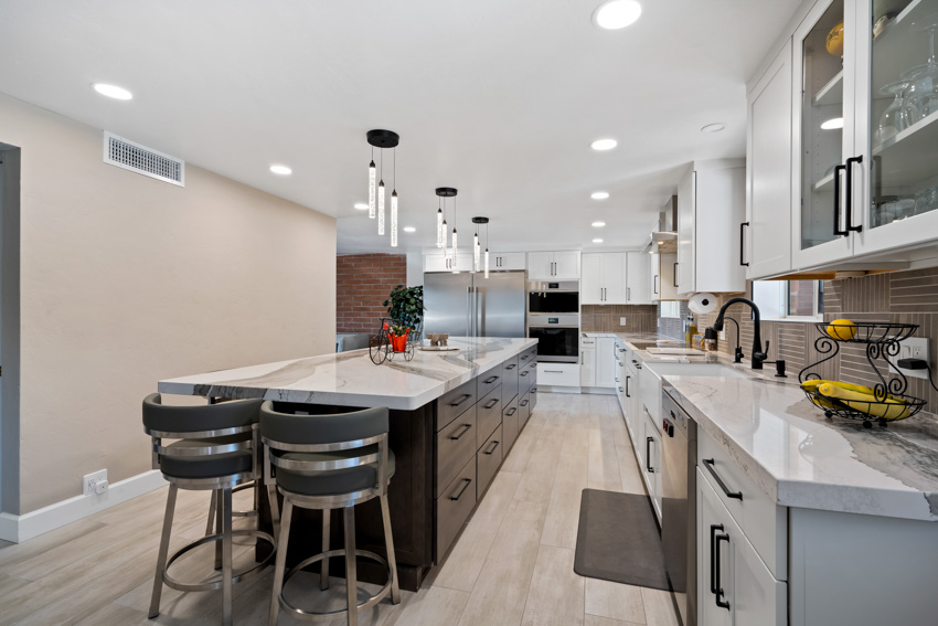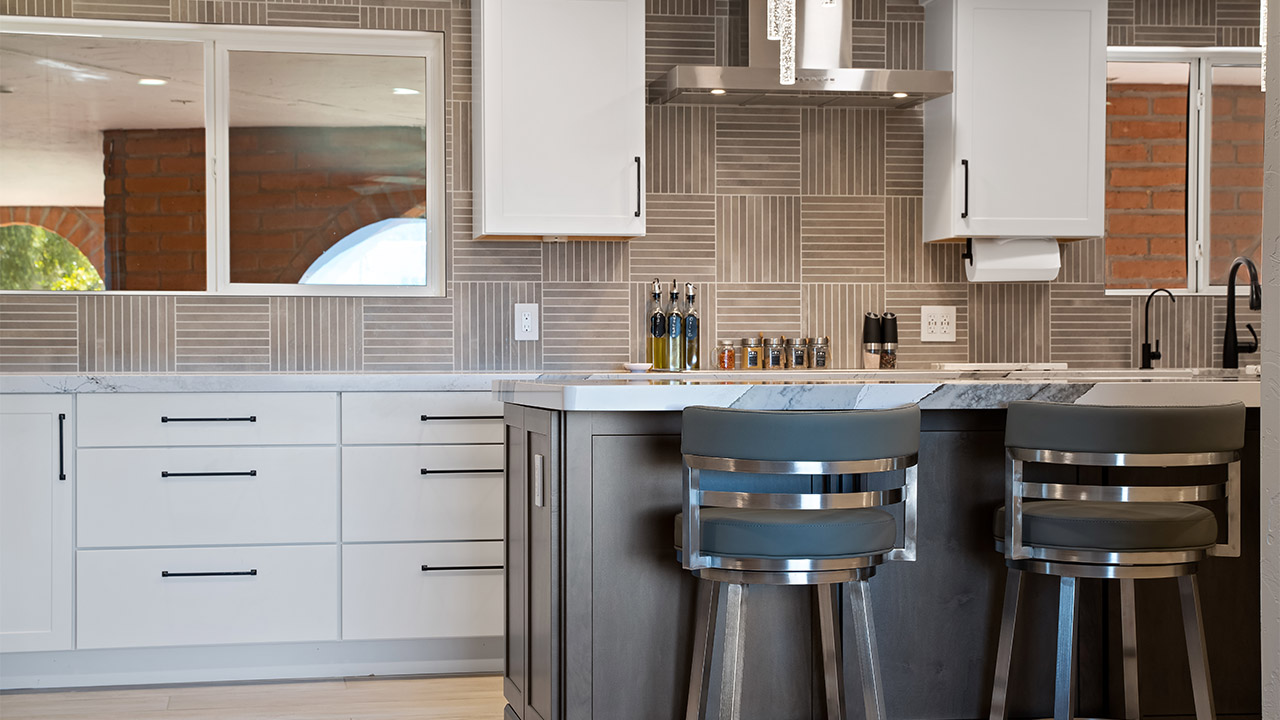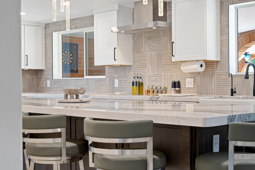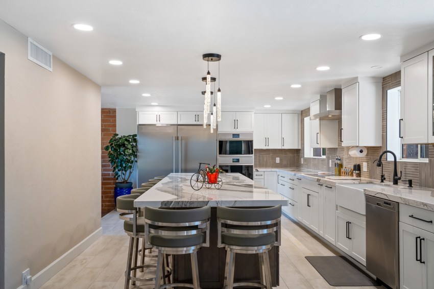 Beloved Built’s kitchen remodel for the Marne family in Tucson, Arizona, blends sleek aesthetics with exceptional functionality. The centerpiece is a full-sized island with luxurious quartz countertops, offering ample workspace and a stylish hub for gatherings. Overhead, modern pendant lights create a warm, inviting ambiance.