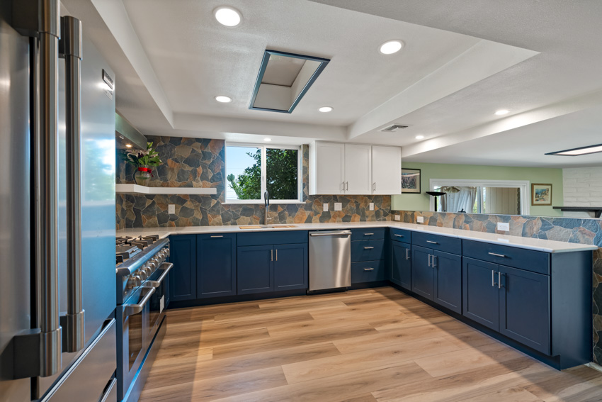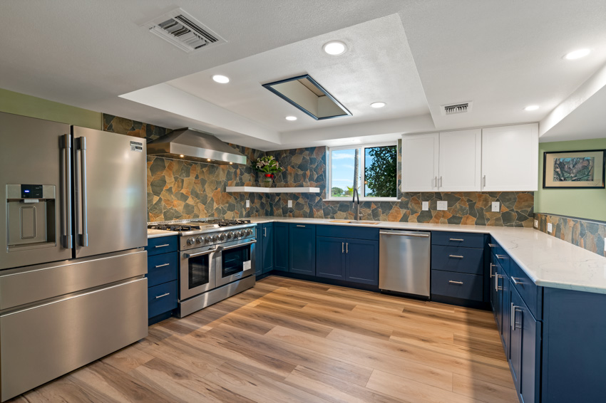 Natural light floods the space, highlighting sleek blue wood cabinetry that provides generous storage while adding warmth. A nature-inspired stone backsplash and light wood-style LVP flooring bring an earthy touch, complemented by high-end stainless steel appliances that combine style and functionality. A spacious stove and refrigerator make hosting large gatherings effortless.