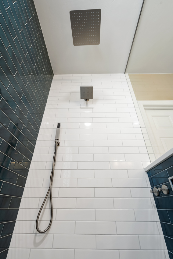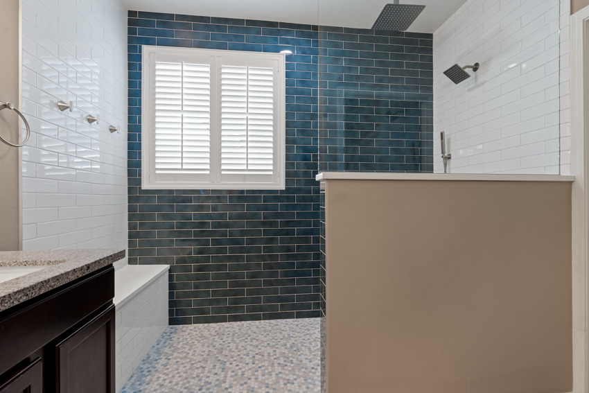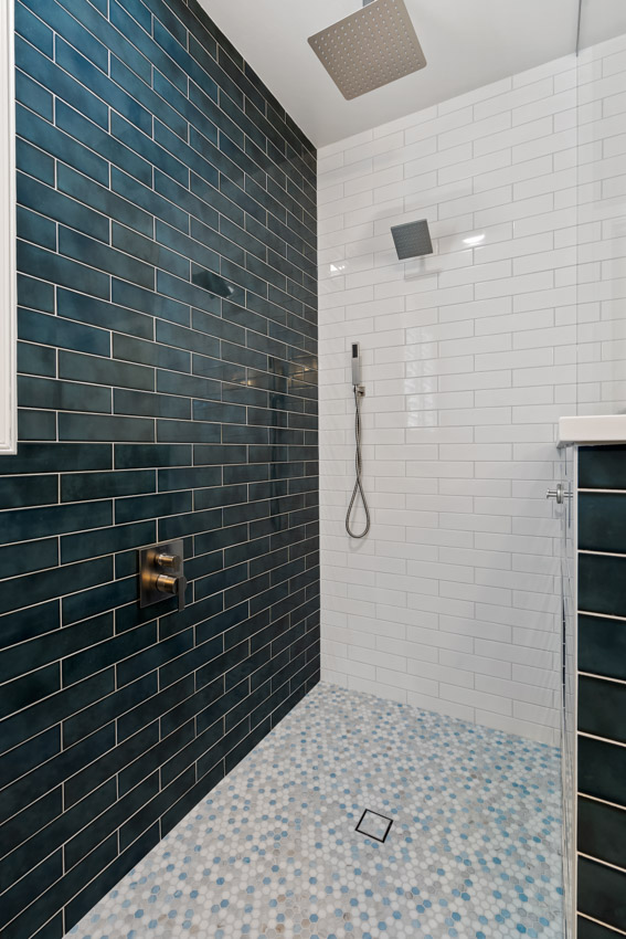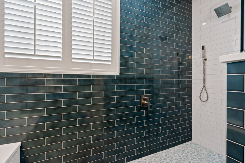 - Deep teal subway tile walls