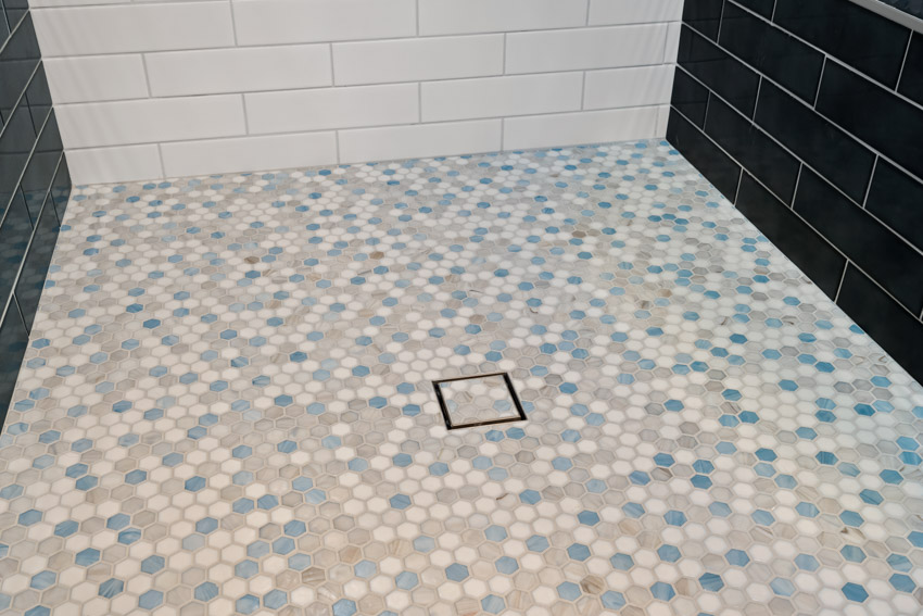 The floor features a mosaic of soft blue, white, and gray hexagon tiles—each piece like a gentle ripple in water. This grounding texture underfoot enhances the meditative quality of the space and provides subtle visual interest.