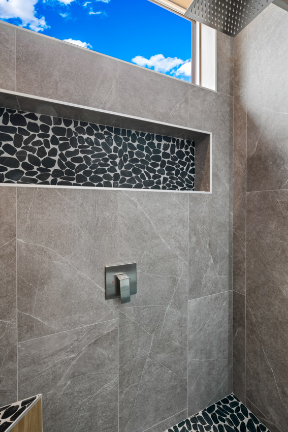 From the moment you step in, you’re enveloped in warmth and luxury, reminiscent of a cozy mountain retreat. A dark floating sink immediately draws the eye upon entering this bathroom renovation, and sleek, modern, minimalist fixtures offset the natural beauty of the stone and woodwork and darker materials that combine to make a luxurious, warm and welcoming space.
