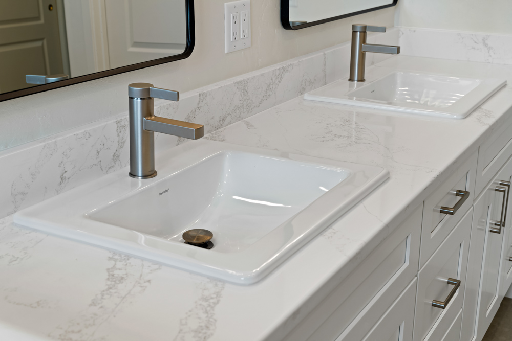 - Rectangular sinks paired with brushed nickel single-handle faucets