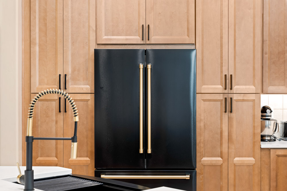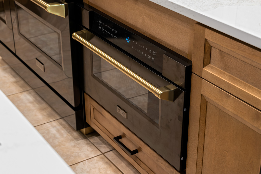 To improve both form and function, we converted an old pantry closet into a large, full-height built-in pantry, creating generous storage while maintaining a clean, seamless look. All new appliances with elegant gold trim introduce a subtle touch of luxury, beautifully paired with a clean white backsplash and modern finishes throughout.